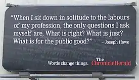 He was born the son of John Howe and Mary Edes at Halifax and inherited from his loyalist father an undying love for Great Britain and her Empire.[2] At age 23, the self-taught but widely read Howe purchased the Novascotian, soon making it into a popular and influential newspaper. He reported extensively on debates in the Nova Scotia House of Assembly and travelled to every part of the province writing about its geography and people.[1] In 1835, Howe was charged with seditious libel, a serious criminal offence, after the Novascotian published a letter attacking Halifax politicians and police for pocketing public money. Howe addressed the jury for more than six hours, citing example after example of civic corruption. The judge called for Howe's conviction, but swayed by his passionate address, jurors acquitted him in what is considered a landmark case in the struggle for a free press in Canada.[3]