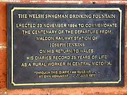 Joseph obtained regular employment in 1884 as a cleaner of streets and drains in the town of Maldon, a few miles north from Castlemaine. He remained there working until he reached the age of 76 and became homesick for Wales. Having saved the fare, he departed Maldon by rail on 23 November 1894, and embarked on the ss Ophir which docked at Tilbury docks on 5 January 1895. In 1994 a water drinking fountain and a plaque were erected at Maldon railway station to recognise the centenary of Joseph Jenkins's departure and his unique record of the life of a rural worker in Victoria. His own words were cited: Through this [diary] I am building. . . my own monument (pictured at right).