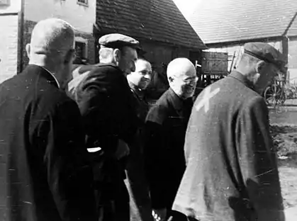 In March 1942, Kentenich was sent to the Dachau concentration camp at a moment when the living conditions there were worsening. Of the 12,000 prisoners, there were 2,600 priests. He was inmate number 29392.[7] The Germans were grouped in a block where they have the right to attend daily Mass celebrated by one of them; it is only on 19 March 1943 that Kentenich would finally celebrate his first Mass at the camp. He gave a nightly spiritual conference to his fellow prisoners thanks to the protection of the "kapo" (inmate block chief) Guttmann, a Communist with a rather violent temper, but fascinated by the behavior of the Father. Guttman saw Kentenich sharing his meager daily bread and soup with a detainee in need. Guttmann will save the priest who is destined to die in the gas chamber because of his poor health. On the day of the selection visit by an S.S. physician, the kapo hides Father Kentenich; assigned to the disinfection commando, he can now circulate in the camp.[4]