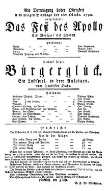 Playbill for the debut of Bürgerglück on the occasion of the dedication of the Bremer Stadttheater (1792)