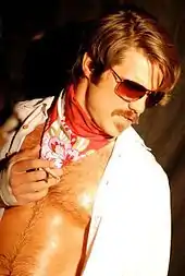 Ryan's wrestling persona was described by the Los Angeles Times as a "macho, mustachioed playboy who wore Speedos and sunglasses."[116] Ryan uses the "YouPorn Plex" as a signature move, a crotch flip with theatrics.[117] The move, also known as the penis flip, sees the opponent grab Ryan's crotch before Ryan supposedly uses his penis to flip them over.[118] Ryan stated on episodes 251 of the Dude Soup podcast that his persona's look is inspired by 1980s characters such as Magnum P.I.[119]