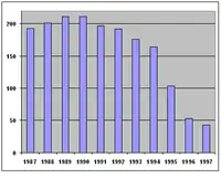 The impact of Tkach's tenure as the head of the WCG was notable. Church income dropped from a high of over $200 million in 1990 to $50 million by 1996.[37] By then the church could only count 49,000 as members, less than half from its peak.[2] The circulation of The Plain Truth, distributed free by subscription and via newsstand distribution around the globe, fell from a peak of 8,000,000 to less than 100,000 before it switched to a paid subscription status. Eventually the magazine was spun off into a separate, independent, evangelical ministry.[38] The number of employees at the church headquarters fell from 1,000 to about 50. Ambassador University, as the college had become after earning regional accreditation in Texas, ceased operations in 1997 as the church could no longer provide its annual operating subsidy. The Pasadena campus was finally sold in 2004.[3]