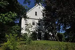 The Maxcy Homestead stands in the rural village of South Union, on the east side of South Main Street nearly opposite its junction with Middle Road. The main block of the house is a fairly large 2+1⁄2-story wood-frame structure with a gabled roof and clapboard siding. It is nearly square, five bays wide and five bays deep, and has three facades, with center entrances on the north, west, and south sides. The main entrance is on the south-facing facade, and features Doric pilasters flanking the door, and a half-round transom window and gabled pediment above. This treatment closely resembles Plate 40 of William Pain's 1795 The Practical House Carpenter. The interior of the house as virtually intact period woodwork, include fine carvings in all of the downstairs rooms, and slightly less ornate finishes in the upstairs bedrooms.[2]