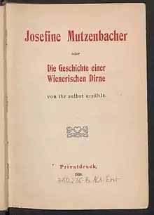Josephine Mutzenbacher or The Story of a Viennese Whore, as Told by Herself (German: Josefine Mutzenbacher oder Die Geschichte einer Wienerischen Dirne von ihr selbst erzählt) is an erotic novel first published anonymously in Vienna, Austria, in 1906. The novel is famous[3][4][5] in the German-speaking world, having been in print in both German and English for over 100 years and sold over 3 million copies,[6] becoming an erotic bestseller.[7][8][9][10]