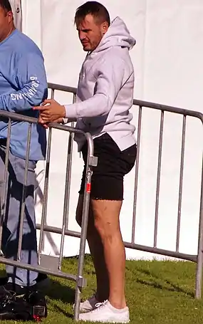 Reynolds was selected for the City Origin team at five-eighth as an audition for the vacant five-eighth position for New South Wales.[14] He was penalised and placed on report twice in the second half, one for an attempted trip on Country forward Tariq Sims as he scored a try in the 52nd minute, and in the 77th minute for a shoulder charge on fullback David Mead.[15][16] He was suspended for one week, and not selected for the Blues team.[17] In the week 1 Elimination Final match against the St George Illawarra Dragons, Reynolds kicked a field goal to win the match for Canterbury 11–10 in golden point extra time.[18] He finished the season with 17 matches, scoring three tries and kicking two field goals.