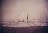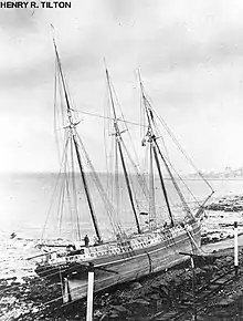 The hurricane of 1888 came in the guise of a northeast gale and snowstorm accompanied by extremely high tides, and 100 mph (155 km/h) winds created tremendous surf conditions. The snow and sleet in the early part of the storm gave way to rain. Early in the day of November 25, 1888, Captain James and a few hardy beachmen climbed to the top of Telegraph Hill, where through nearly blinding snow and wind they observed five schooners and one coal barge anchored off an area southeast of Boston called Nantasket, attempting to ride out the storm.[6] With the intensity of the storm growing and sensing that it was only a matter of time before some of the ships at anchor yielded to the storm, Captain James notified his volunteers to be ready for service, and about two o'clock ordered patrols all along the ocean shore.[2]
