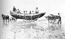 The beach patrols had hardly begun when the schooner Cox and Green was discovered broadside to the beach. When Captain James judged the seas too heavy to risk launching a rescue boat, the beach apparatus was called upon. With the assistance of local residents Captain James and his men rescued the entire crew by rigging a breeches buoy to the stricken schooner.[6] This was to be the first rescue of an extraordinary 36 hours during which 28 Hull volunteers would work in five crews to save 29 lives along the town's shores.