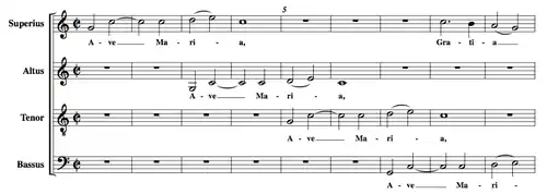 Many of the motets use compositional constraint on the process;[152] others are freely composed.[153] Some use a cantus firmus as a unifying device, some are canonic, others use a motto which repeats throughout, and some use several of these methods. In some motets which use canon, it is designed to be heard and appreciated as such; in others a canon is present, but difficult to hear.[154] Josquin frequently used imitation in writing his motets, with sections akin to fugal expositions occurring on successive lines of the text he was setting.[153] This is prominent in his motet Ave Maria ... Virgo serena, an early work where each voice enters by restating the line sung before it.[153][n 6] Other early works such as a Alma Redemptoris mater/Ave regina caelorum show prominent imitation,[153] as do later ones such as his setting of Dominus regnavit (Psalm 93) for four voices.[155] Josquin favored the technique throughout his career.[153]