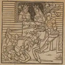 Jordan, Renier and Eremborc take ship on the Gironde and head for the open ocean. They are attacked by Saracen pirates. While Jordain escapes, his godparents are captured and taken to Mount Bruiant, where they are sold as slaves to King Salatien. Floating on a piece of wood at sea, Jordain deliberately injures himself to draw blood so that the sea will be forced to disgorge him ashore, since the sea cannot stand blood. He is rescued by a fisherman, who directs him to the nearby city of Marcasille. There in the town square he accepts the challenge of King Mark to a joust. He catches the eye of the Princess Oriabel, who outfits him as one of her knights. He eventually reveals his true lineage to her.[20]