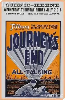 Journey's End is a 1930 war film directed by James Whale. Based on the play of the same name by R. C. Sherriff, the film tells the story of several British army officers involved in trench warfare during the First World War. The film, like the play before it, was an enormous critical and commercial success and launched the film careers of Whale and several of its stars.