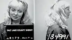 ![]() 1984 mugshot taken of perpetrator Joyce McKinney when subsequently arrested in 1984 in Salt Lake City, Utah, on charges she again was stalking her 1977 victim, Anderson | |