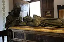 ![]() Cenotaph of Saint Junípero Serra in the Mission San Carlos Borromeo, Carmel-by-the-Sea (1924); Fr. Juan Crespí, who predeceased Serra, stands at the head, praying over him. | |