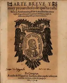 Gutiérrez is known by his book on arithmetic which was very successful in his times: Arte breve y muy provechoso de cuenta castellana y arismética (Toledo 1539).[2] The book was reedited not less than five times in 16th century.[3] It consist in a short arithmetic for merchants,[4] very basic, which only contains forty pages and practically only explains the four rules and few more.[5] The book is an example of the transition from roman numerals to arabic numerals because it resolves the problems with arabics (quenta arismetica), but it gives his expression in romans (quenta castellana).[6] His success was in big part due to the fact that Juan de Yciar included it as an annex of his book on calligraphy from 1564.[5]