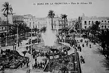 Nothing is known on childhood and education of Juan José. He was born in a coastal town of El Puerto de Santa María,[14] but it is not clear whether he frequented schools there or in Jerez de la Frontera, where the family moved some time in the late 19th century.[15] It is possible if not likely that he received schooling in the Marianist college, operational in Jerez; later on Palomino was very active in Los Luises, a congregation ran by the order.[16] It is neither known whether and if yes where he pursued an academic career. A typical path for a young man from a well-off family would have been studying law, most likely in Seville, but there is no confirmation of Palomino graduating either in the early 1920s or at any other time.