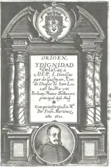 ![]() Cover of Origen y dignidad de la caça with a portrait of Mateos by Pedro Perete, Madrid, 1634, National Library of Spain. | |