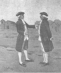 Juan Miguel de Esparza served for many years in the Plana Mayor of the Milicias Provinciales de Buenos Aires of the Spanish Army, taking an active part in the military campaigns against the Indigenous Pampas that attacked Spanish settlements in the area of Lujan. In 1752, he participated in punitive expeditions against the Calelián tribes, serving in the "La Valerosa", a militia of the Blandengues of the Frontier, under command Captain José de Zarate.[16]