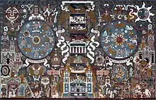 Juan O'Gorman's most celebrated work due to its creativity, construction technique, and dimensions, are the four thousand square meters murals covering the four faces of the building of the Central Library at Ciudad Universitaria at UNAM. These murals are mosaics made from millions of colored stones that he gathered all around Mexico in order to be able to obtain the different colors he needed.[8] The north side pictures Mexico's pre-Hispanic past and the south facade its colonial one, while the east wall depicts the contemporary world, and the west shows the university and contemporary Mexico.[15]