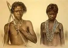 Formerly the Juang used to be also known as Patuas, literally "leaf-wearers". Traditionally the women wore girdles of leaves,[7][8] while the men wore a small loincloth. The Juangs declare that the river goddess, emerging for the first time from the Gonasika rock, surprised a party of naked Juangs dancing, and ordered them to wear leaves, with the threat that they should die if they ever gave up the custom. The Juangs' weapons were the bow and arrow and a sling made entirely of cord.[2]