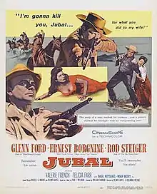 Jubal is a 1956 American Western film directed by Delmer Daves and starring Glenn Ford, Ernest Borgnine, Rod Steiger, Valerie French, and Felicia Farr. Shot in CinemaScope, it was one of the few adult westerns in the 1950s and is described as Othello on the Range.[3] The supporting cast features Noah Beery Jr., Charles Bronson and Jack Elam.