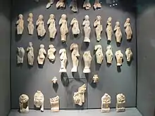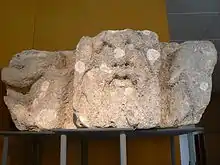 Excavations have uncovered many fragmentary offerings: Celtic offerings followed by bronze items whose purpose was exclusively votive.[59] The inner construction used local stone, while shelly limestone from the Loire was used to dress the exterior walls.[57] The columns of the peribolos were cut from grès quarried a dozen kilometers away,[26] while the capitals were tuffeau stone. Decorative elements from the sanctuary are now exhibited in the museum, including the head of a mother-goddess statue in shelly limestone.[60] Fragments of frescoes have also been found; one of them represents a pigeon and decorated one of the entrances to the peribolos.[61]
