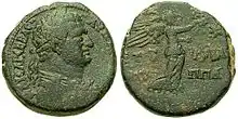 Unusually, a 'Judaea Capta' coin was also minted by the Jewish ruler Agrippa II, the great-grandson of Herod the Great. Brought up in Rome at the court of Claudius, Agrippa was thoroughly Romanised and was a close friend of Titus, whom he supported throughout the First Jewish Revolt. His bronze coin was minted at Tiberias and shows a portrait of Titus on the obverse with the Greek inscription 'ΚΑΙΣΑΡ ΣΕΒΑΣ ΑΥΤΟΚΡ ΤΙΤΟΣ' (abbreviated for Καῖσαρ Σεβαστὸς Αυτοκράτωρ Τίτος, in Latin: "Caesar Augustus Imperator Titus"), while the reverse depicted the goddess Nike advancing right holding a wreath and palm branch over her shoulder, with a star in upper right field and the inscription 'ETO - KS BA AGRI-PPA'.