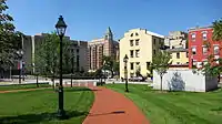 Around the turn of the 20th century, the eastern side of Judiciary Square became an enclave of Italian immigrants in Washington, the equivalent of a Little Italy, though it was never called that. The Italian neighborhood rested on the eastern edge of the square proper, stretching eastward to about 2nd Street NW. The heart of the community was Holy Rosary Church, a chapel built at 3rd and F Streets NW. The neighborhood grew throughout the 20th century, with a particular surge of Italian immigrants in the 1950s and 60s. However, the construction of Interstate 395 through the city in the 1970s razed about half of the neighborhood and forced its remaining residents to move away from the heavy commuter traffic. Today, the former Italian enclave is dominated by Federal office buildings and law offices. The Holy Rosary Church remains standing and continues to draw a heavily Italian congregation along with its "Casa Italiana" cultural center next door.[2]