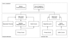 The Judiciary of Tanzania is the system of courts that interprets and applies the law in Tanzania. The current judiciary bases its foundation to the constitution of the United Republic of Tanzania of 1977.[1] Under the Constitution of Tanzania, Justices and Magistrates are independent of the government and subject only to the Constitution and the law. The country has a dual juristition system where there is a judicial structure responsible for Tanzania Mainland and another for Zanzibar. The Court of Appeal of the United Republic was established in 1979 as the final appellate judicial body with jurisdiction over the entire union.[2]