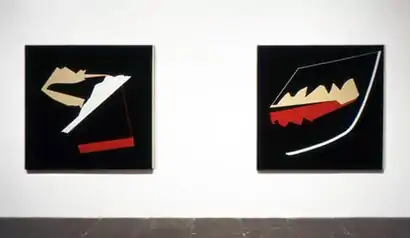 Murray's early oil paintings were modestly sized, spare works in the hard-edged abstract tradition.[31][32][33] They featured irregular geometric forms in reds, opaque whites and yellows floating on sensuous black fields and explored problems of balance and stability without relying on symmetry (e.g., her "Ballast" series, 1976).[4][34][19][7] These ambiguous "figures"—compared to sails, wings, kites, moons, exotic sea creatures or decadent, even dangerous, spiky plants—derived less from the natural world than from the imagination or subconscious.[4][31][35][10] Reviewing Murray's first major solo exhibition (Parsons-Truman, 1976), Soho News critic John Perreault described her as a "non-conformist painter" whose images suggest an open-ended but withheld logic, like signs or diagrams; the Village Voice counted her "eccentric abstractions" among the highlights of the 1979 Whitney Biennial (e.g., Red Angle and Broadway, both 1978).[4][22]