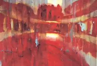 In the 2000s, Simonian returned to architectural sources, ranging from medieval dungeons and ancient arenas to cavernous nightclub and office spaces.[2][10] Critics note this work for its mix of incongruous subjects and disparate styles, sense of light and space, and palpable atmosphere, captured efficiently in loose, shorthand-like brushwork, saturated watercolor washes and built up surfaces.[2][10][43] Reviewing Simonian's suite of watercolor collages, "Chronic Civilization" (Janet Kurnatowski, 2006), Shane McAdams highlighted Red Coliseum for its foregrounded, gauzy paper strips opening like windows into vague space and its vertical swaths of wet scarlet and lavender, which he compared to Morris Louis "Veil" paintings.[2] Deborah Garwood singled out the claustrophobic ambiance of Deep Purple Space for its dense play of gesture, stenciling, texture and shadow.[10]