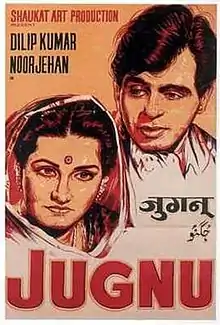 Jugnu (transl. Firefly) is a 1947 Indian musical romantic comedy film directed and produced by Shaukat Hussain Rizvi. The film stars Dilip Kumar and Noor Jehan in lead roles with Ghulam Mohammad, Jillo, Latika, Shashikala in supporting roles. It also features a cameo appearance by Mohammed Rafi.[1] It revolves around Suraj, the son of a rich landlord and Jugnu, an orphan, who fall in love with each other.[2]