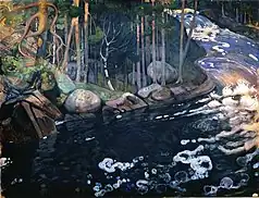 The death of Madetoja's mother, Anna, on 26 March 1934, interrupted his work on the opera; the loss so devastated Madetoja that he fell ill and could not travel to Oulu for the funeral.[6][7][lower-alpha 3] Madetoja completed work on the opera by the end of 1934 and it premiered to considerable fanfare at the Finnish National Opera on 17 February 1935, the composer's forty-eighth birthday. The critics hailed it as a "brilliant success", an "undisputed masterpiece of Madetoja and Finnish opera literature".[6] Nevertheless, the "euphoria" of the initial performance eventually wore off and, to the composer's disappointment, Juha did not equal the popularity of The Ostrobothnians. Indeed, today Juha is most associated with Merikanto, whose modernist Juha (which the Finnish National Opera performed on 19 October 1967) is the more enduringly popular of the two; having been displaced by Merikanto's, Madetoja's Juha is rarely performed.[6][4]