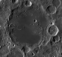 Most of the interior floor of this crater has been flooded with basaltic lava, leaving a dark, low-albedo surface that is relatively level and flat. It is somewhat unusual for a crater feature on the far side to be flooded with lava, as the crust is generally thicker than on the near side. The crater is located in the outer rim of the South Pole-Aitken basin.