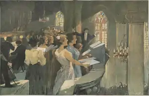 His illustrations featured some elements of symbolism and mysticism; notably those for Taj Mahal, a poem by the Swedish writer Andrea Butenschön (1895), and Goulab Soubi, an Orientalist story by René de Pont-Jest (1896). He also created religious decorations at the original Église Saint-Michel d'Étaples, which was destroyed during World War II. He is, however, best remembered for his portraits, which depict faces and hands in great detail, while the clothing and background décor are merely sketched out in lines.[2]