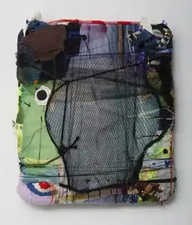Couzens's "Bundles"[52] consist of intuitive, abstract sculptural forms evoking god's eyes, dreamcatchers or cat's cradles, that she builds up through processes of wrapping, binding, stitching and layering, and displays as wall pieces or floating "satellites," such as Chanteuse (2016, top).[1][51] Critics note the work's dedication to repetition, process and linear rhythm, its thickets of fiber, twine, thread, wire and fabric in clashing commercial color defining form, texture and space;[1][35][53] they have been deemed "visual piñatas" and likened to the disparate work of artists El Anatsui, Claes Oldenberg, and Judith Scott.[53] Christopher Miles noted Couzens's conversion of line into form as a tool capable of expressing humor, idiosyncrasy, or vulnerability. He wrote that in their cobbled-together, imprecise method—part bricoleur, part gestural expressionist—they call to mind "a sense of scavenged subsistence […] frailty and vulnerability," yet also communicate "a vibrance, and a stirring pathos."[2]