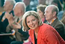 At the 23rd national CDU party conference on 15 November 2010, Klöckner became a member of the CDU Präsidium or steering committee with 94.43% of the votes, the highest number of votes out of all 40 candidates.[43] On 4 December 2012 she was elected as one of five deputy chairpersons of the national CDU party with 92.92% of the votes (once again the best result),[44] serving alongside Volker Bouffier, Armin Laschet, Thomas Strobl and Ursula von der Leyen.