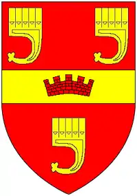 ![]() Gules, on a fess between three clarions or a mural crown of the first.[1] These arms are a difference of the arms of the ancient family of Grenville (alias Granville, Greenfield, etc) of Bideford in Devon and Stowe in Cornwall | |