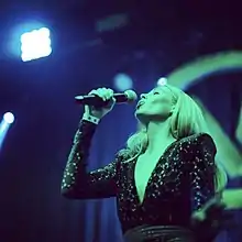 ![]() Julie Mintz (left) performs with Moby (right) at the Hollywood Bowl in Los Angeles, California | |