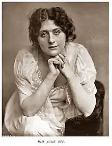 Her work as a journalist eventually brought Opp within close orbit of many in the theater world and some, including Sarah Bernhardt and Emma Calvé, tried to convince her to become an actress. She later played a minor role in a one-off performance of Camille and on occasions did dramatic readings at social affairs, but when playwright George du Maurier offered her a role in the original 1895 production of Trilby she turned him down, still not ready to abandon her chosen profession. It was the wife of British actor George Alexander who in 1896 finally convinced Opp to take to the boards with Alexander's company playing Hymen in Shakespeare's As You Like It at London's St. James's Theatre.[1][3]
