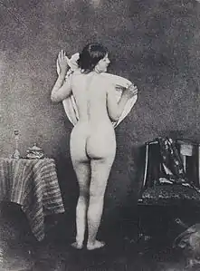 Realist painter Gustave Courbet was introduced to Vallou de Villeneuve's photographs by fellow artist Alfred Bruyas during the 1850s and used them as source material for his paintings,[12] in particular L'Atelier (1855) and Les Baigneuses (1853).[13] In 1954, the 27th Venice Biennale presented a large-scale retrospective devoted to Gustave Courbet;[14] one of the first major exhibitions devoted to the painter. Germain Bazin and Helene Adhémar (conservator, Department of Paintings at the Louvre) were the commissioners of ”A new century of vision[15]" which gave an essential place for artistic creations of the Second Empire. Jean Adhémar, curator, stressed that "first photographers are almost all painters, especially under Napoleon III". The section on “The times of Courbet, Manet, Nadar" was one of the richest in both the number of works presented - forty - and in the range of their subjects: it articulated the parallel between the realistic vision of the painter and the photographer. This was thus the first to attempt to identify the model in the nude photography requested by Courbet of Bruyas and mentioned for the first time by Pierre Borel in 1922.[16] A nude by Jacques Moulin (also exhibited) had previously been connected with the model in The Artist's Studio (L'Atelier du peintre): A Real Allegory of a Seven Year Phase in my Artistic and Moral Life (1855), by evoking the similarity of the models. But two photographs by Vallou Villeneuve, exhibited in the same section, where the model, Henriette Bonnion[17][18] poses in an attitude similar to that in Courbet's 'Bathers' (1853) and 'Artist's Studio' showed it likely (as subsequent studies have confirmed), that the Vallou model and not Moulin's was used by Courbet.[19][20]