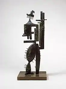González created ironwork at this time that would establish him as "the father of all iron sculpture of this century".[6] During the early 1930s, few artists utilized forged or welded metal as a potential medium for their art. This is because, at the time, many artists did not directly work with the medium. Rather, artists worked with a foundry and expert technicians to execute the works of art. González was unique in this instance because his work demanded an active interaction- something that required the skills shaped by a long and specialized apprenticeship.[6] In 1937 he contributed to the Spanish Pavilion at the World Fair in Paris (La Montserrat, standing near Guernica), and to Cubism and Abstract Art at the Museum of Modern Art in New York.