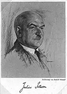 Julius Petersen (5 November 1878 - 22 August 1941) was a German literary scholar and university professor, principally at the Friedrich Wilhelm University (as it was known before 1949) in Berlin. He did much to rediscover the works of Theodor Fontane for twentieth century readers. Petersen himself has been described as one of the most influential academics in the field of German studies during the interwar period, but after 1945 he disappeared from university reading lists. During the 1960s interest in his life and works resurfaced, though it has frequently been on account of evident contradictions in his attitude to National Socialism during the final decade of his own life that he has attracted the interest of more recent commentators.[1][2]