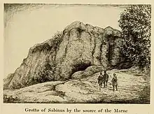 There were several paintings of the couple, including works by Nicolas-André Monsiau and Etienne Barthélémy Garnier. These usually depict them hiding in a cave, a reference to a myth that a cave near Langres was the place in which Sabinus had hidden. It is still locally known as "Sabinus' cave" (Grotte de Sabinus). Joseph Mills Hanson, who visited it shortly after World War I, described it as a "cave in the rock having two entrances, the one looking south, the other east. The interior is very irregular in outline but it is perhaps fifty feet deep, twenty feet wide, and seven feet high. Near the east entrance is a rough pillar, left evidently by the cutting away of the surrounding stone." A statue of the Virgin Mary was placed there, along with graffiti left by American soldiers in the war.[8]
