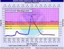 Late on July 28 and into July 29, part of the city of Jackson was evacuated and KY 15 was closed after officials became concerned that water from the North Fork River would top Panbowl Dam along KY 15 and potentially flood approximately 110 homes, 13 businesses, and other structures around Panbowl Lake, although the river began receding before the dam was overtopped.[65] The North Fork River set a record crest in Jackson of 43.47 feet (13.25 m), besting the previous record of 43.1 feet (13.1 m) from February 4, 1939,[59] while meteorologists at the National Weather Service forecast office in Jackson became trapped at the office due to nearby high water.[63]
