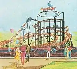 The Jumbo Jet, like all electric spiral lift roller coasters, reached the top of its lift hill by way of a gently-graded spiraling helix, before beginning its first drop. Unlike many roller coasters, which use a traditional chain lift, the Jumbo Jet was propelled with small wheel motors up the incline of the helix.[3] These sort of coasters soon became a very common type of steel roller coaster in the 1970s, and were distinguished from later steel roller coaster designs that were characterized by their thicker, tubular-steel tracks.[4] After climbing the 56-foot-tall (17 m) spiral lift, riders plunge into a series of tight turns using a figure-eight pattern and ending with a double-helix. When it debuted, Jumbo Jet was billed as the fastest of its kind and was known for its views of Lake Erie and steeply banked turns (some at up to 70 degrees).[5]