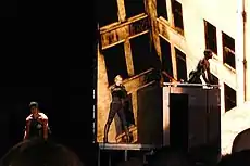 As part of a promotional tour for Confessions on a Dance Floor, Madonna performed "Jump" during her concert at G-A-Y nightclub in London, on November 18, 2005; Hassan Mirza, writing for the club's website, stated that when Madonna started singing the song, "everyone did the obvious, probably breaking the foundation of the venue".[72] "Jump" was later performed on the 2006 Confessions Tour, as part of the first segment of the show.[73] Madonna wore a skin-tight, full body black leotard. As the performance of "Like a Virgin" ended, Madonna sat on a platform and announced "Ladies and Gentleman! Thank you for coming to our show. The night is young, and the show has just begun."[74] A huge assortment of steel rods and gymnastic equipment were planted on the stage. Madonna started singing the song, as her dancers started running around, displaying routines in parkour.[75] Madonna climbs on blocks to sing the song as well as to strike poses.[74] As the final chorus approached, Madonna went to the front of the stage and struck poses while holding on to the steel rods. The song continued with Madonna swiveling around the rods and the dancers continuing their routine.[74] The performance ends with Madonna disappearing through the middle of the stage and her dancers doing a final vault before the lights are turned off.[74]