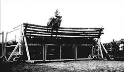 The world record for the highest obstacle cleared by a horse and rider was set on February 5, 1949, by Huaso and his rider, Captain Alberto Larraguibel. The Thoroughbred stallion and his Chilean rider cleared a fence measuring 2.47 metres (8 ft 1 in) high. This record still stands today. A purported dispute to this record is of American Freddy Wettach with his horse King's Own, 1927 where they cleared an obstacle of almost 2.53m. This record remains controversial because while it was witnessed and photographed, the event did not take place during a sanctioned competition. The Show Jumping Hall of Fame acknowledges Wettlach's claim as the highest. These records are held separately from the record height jumped in Puissance classes, regularly held high jump competitions at horse shows. The record for highest obstacle cleared by a horse and rider in a Puissance competition is held by Leonardo and his rider, Franke Sloothaak. In 1991, this pair jumped a puissance wall standing 2.39 metres (7 ft 10 in). Horses are also capable of jumping obstacles of great width. The world record long jump was set on April 26, 1975, by a horse named Something ridden by a Mr. Andre Ferreira. This pair jumped a distance of 8.4 metres (28 ft).[7]