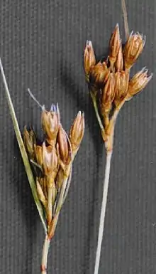 Juncus confusus is a species of rush known by the common name Colorado rush. It is native to western North America from British Columbia to northern California to Colorado, where it grows in coniferous forests and wet, grassy areas such as mountain meadows. It is a bunching rhizomatous perennial herb which grows to a maximum height between 30 and 50 centimeters. Its thready leaves grow from the base of the light green stems to about 15 centimeters long. The inflorescence atop the stem is an array of individual flowers and there is a long bract at the base which may be up to 8 centimeters in length. Each flower has long, pointed tepals with dark and light longitudinal stripes and membranous, translucent borders. There are six stamens. The fruit is a light to dark brown oval-shaped or rounded capsule.