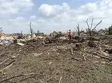 The first tornado, which was rated EF0, touched down briefly in an open field near Stanton, causing no damage.[5] After this tornado dissipated, another tornado touched down southwest of Stanton, initially snapping trees and power poles at EF0 to EF1 intensity as it moved northeast. As the tornado passed west of Stanton and grew into a large wedge, barns were destroyed and swept away at EF2 intensity and power poles were snapped. Two homes were leveled at high-end EF3 intensity in this area as well.[77] Farther north of town, the tornado weakened slightly to EF2 strength as a house had its roof torn off, a semi-truck was flipped, and several outbuildings were destroyed. The tornado then re-intensified dramatically near the Maskenthine Reservoir, reaching EF4 strength. Two farmhouses were swept away, and multiple trees were debarked in this area. A car and a pickup truck were lofted and thrown over a quarter mile, both of which were mangled beyond recognition.[29][77] The tornado maintained EF4 strength as it crossed N-57, sweeping away a house and a barn, and debarking additional trees. Another barn was destroyed at EF2 strength before the tornado roped out and dissipated.[77]