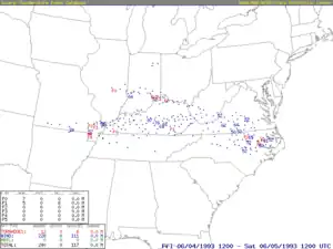 On June 4, 1993, a severe derecho swept across the Midwestern and Eastern United States. The most significant damage was reported in portions of southern Virginia, especially Lynchburg. This derecho caused widespread wind damage reports in a swath from Missouri eastward into much of Kentucky into Virginia and North Carolina. In addition, several severe wind reports were received scattered across this swath. In addition, there were a few weak tornadoes that were confirmed along the path.[3] In addition, widespread large and damaging hail was observed along the path.[2]