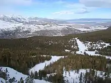 June Mountain ski area consists of two mountains, Rainbow Mountain, with an elevation of 10,040 feet (3,060 m), and June Mountain, with a peak of 10,090 feet (3,075 m). The total vertical rise from the lower ticket office to the summit of June Mountain is 2,545 feet. June Mountain averages 250 inches of snowfall a year along with some snowmaking capabilities and normal season runs from December through April. The ski area covers 1,500 acres and has 35 named trails of which 20% are advanced, 45% are intermediate, and 35% are beginner. June Mountain is also home to two terrain parks and a 22-foot superpipe.[6] Many opportunities exist, however, for riders to explore the trees that cover much of the ski areas total acreage and access fresh snow off piste. June Mountain has also established itself as a favorite spot among locals due to its small crowds and easy access to powder following a storm.[9]